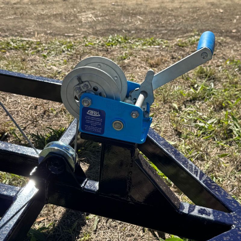 The main pole lays flat on the ground so you can spike the fabricated roll while it’s lying down — no heavy lifting required. Once secured, a winch is used to hand-wind the roll upright, ready to start running wire down the line.